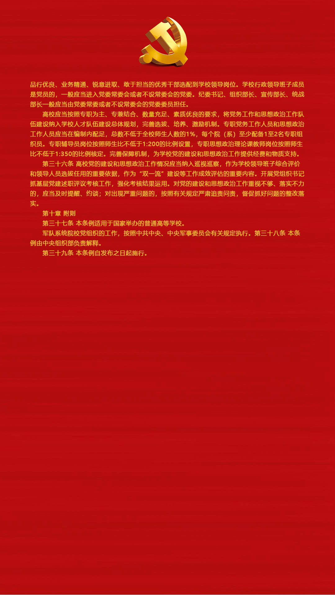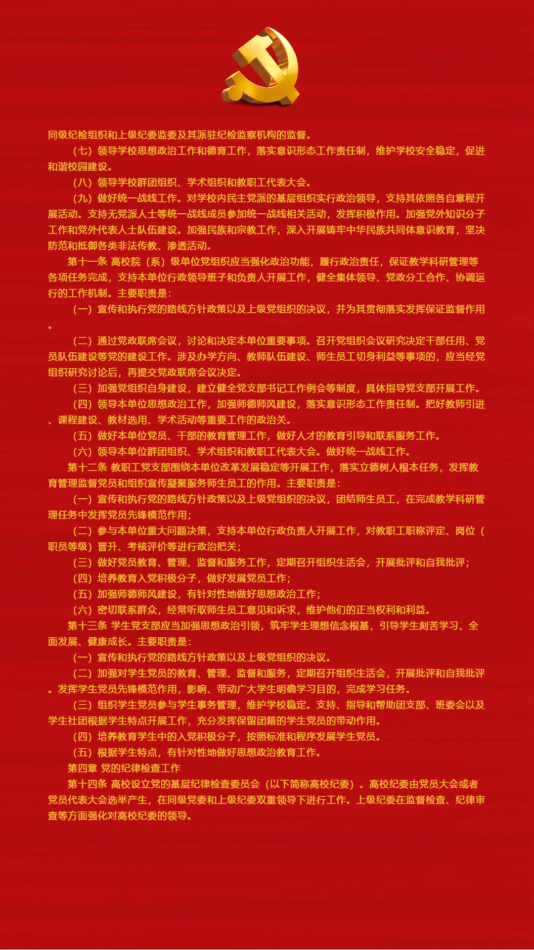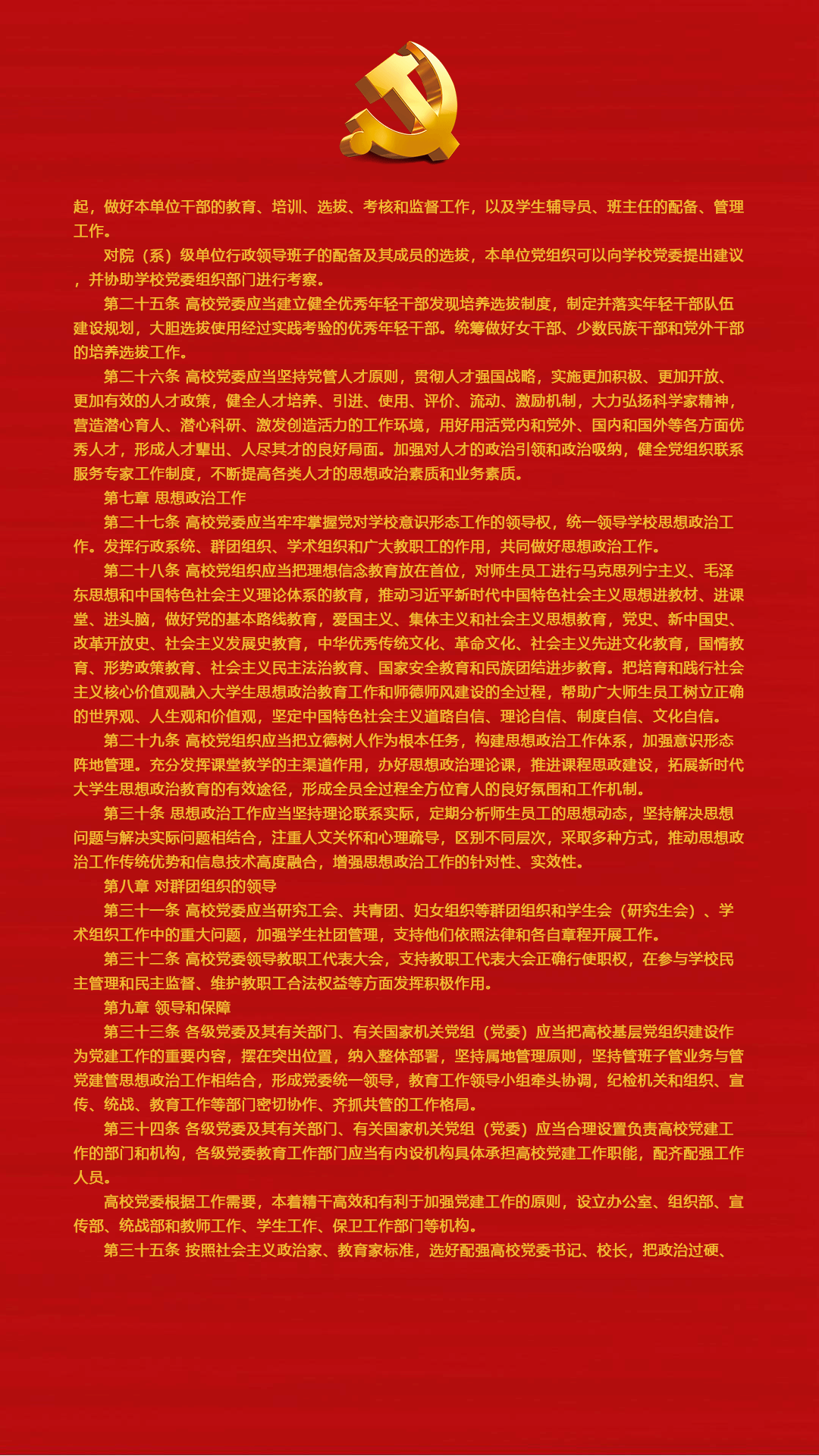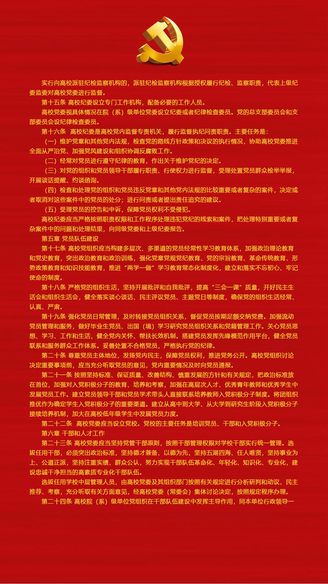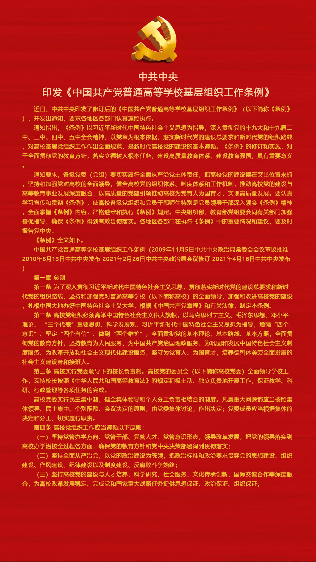 中共中央印发《中国共产党普通高等学校基层组织工作条例》