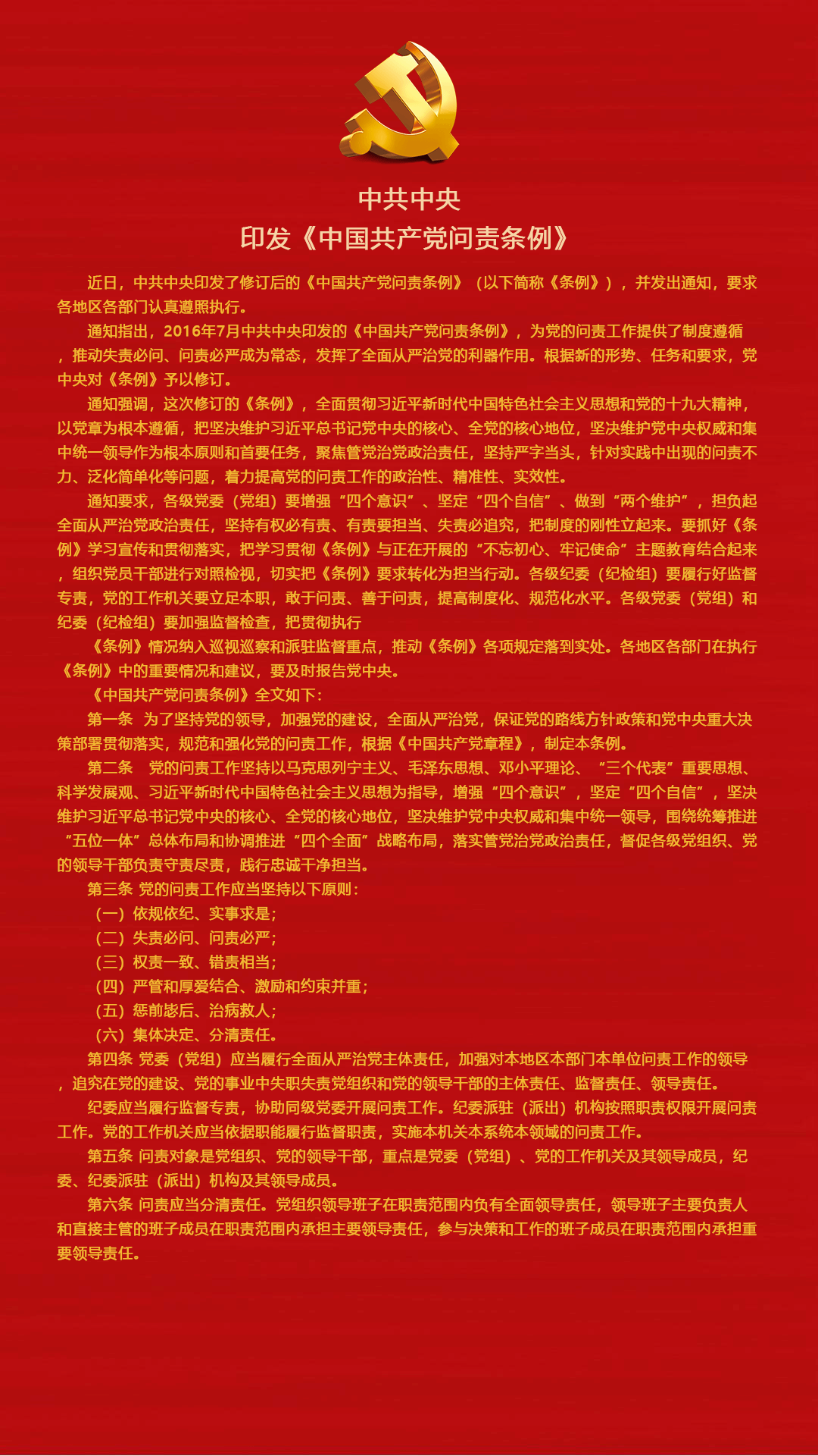 中共中央印发《中国共产党问责条例》