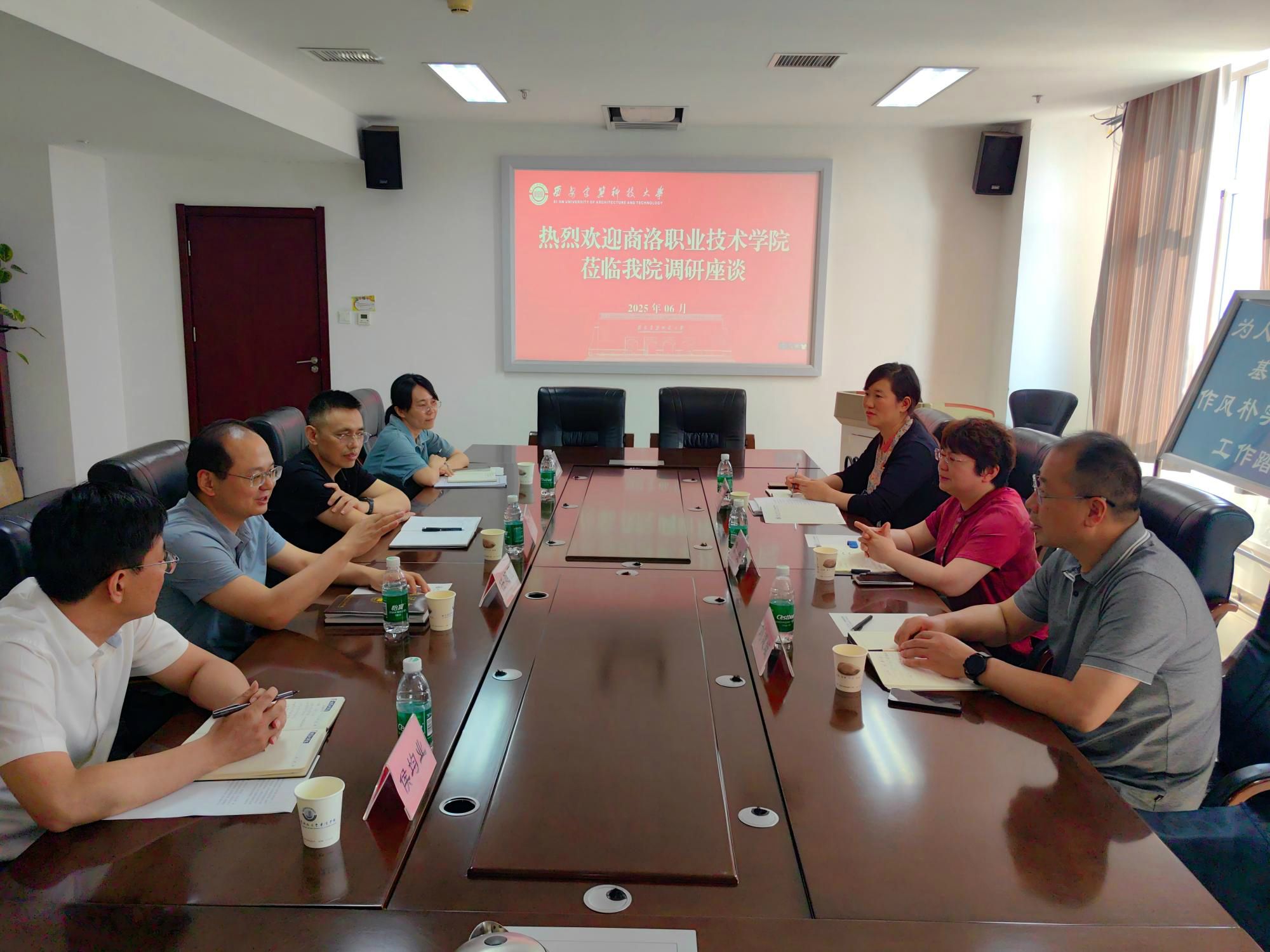 6月12日下午,商洛市职业技术教育培训中心副主任张维一行来我院交流座谈。我院院长任建国,副院长孙小刚及相关科室负责人参加座谈会。