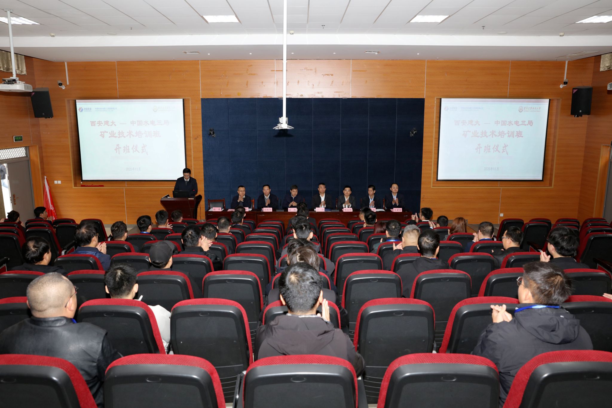 11月10日上午,中国水利水电第三工程局有限公司矿业技术培训班在我校开班。中国电建集团国际工程有限公司矿产事业部矿业处处长梅运先,中国水利水电第三工程局有限公司副总经理、总工程师任强,组织人事部主任彭林华,海外事业部党总支副书记、执行总经理白海瑞,海外事业部副总经理闫军盈,我校副校长雷鹏,继续教育学院院长、基地办公室常务副主任任建国出席开班仪式。仪式由继续教育学院副院长赵亮主持。